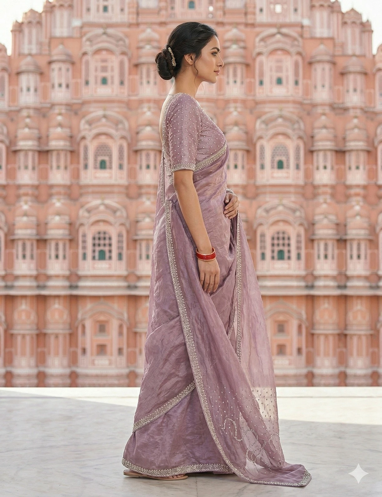 Pair this tissue silk saree with gold jhumkas, kundan earrings, or a delicate choker set to highlight its elegant zari detailing. Style your hair in a sleek bun, soft waves, or a classic low bun with gajra for a refined traditional look. Complement the outfit with gold bangles, a statement ring, and metallic heels or embroidered juttis. For makeup, opt for soft rosy blush, champagne eyeshadow, and a mauve or nude lipstick to beautifully complement the dusty mauve shade of the saree.