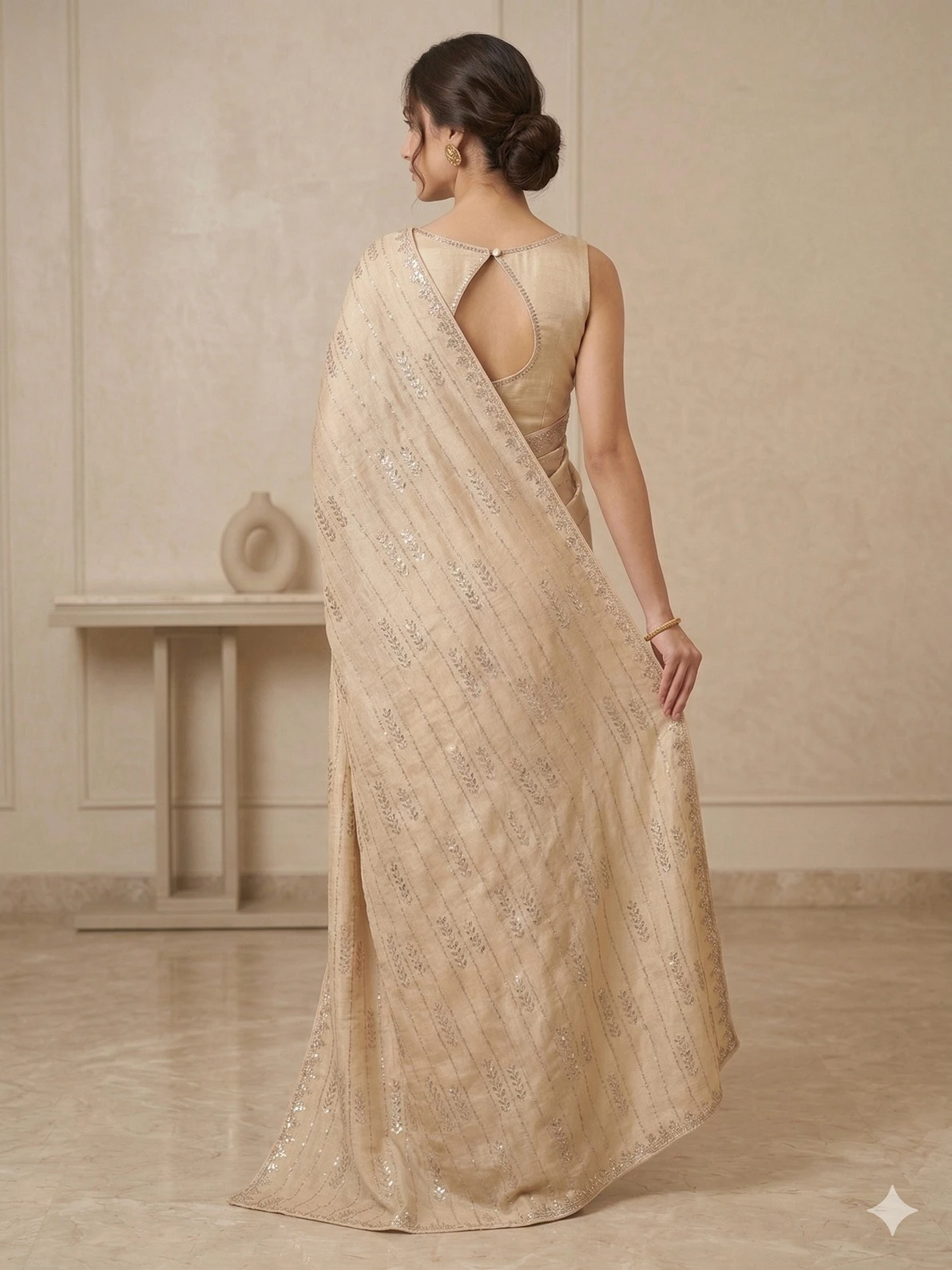 Pair this Beige Silk Chiffon Saree with gold or pearl jewellery, soft natural makeup, and a sleek low bun or soft waves. Nude or metallic heels along with a minimalist clutch will complete the elegant and refined look.