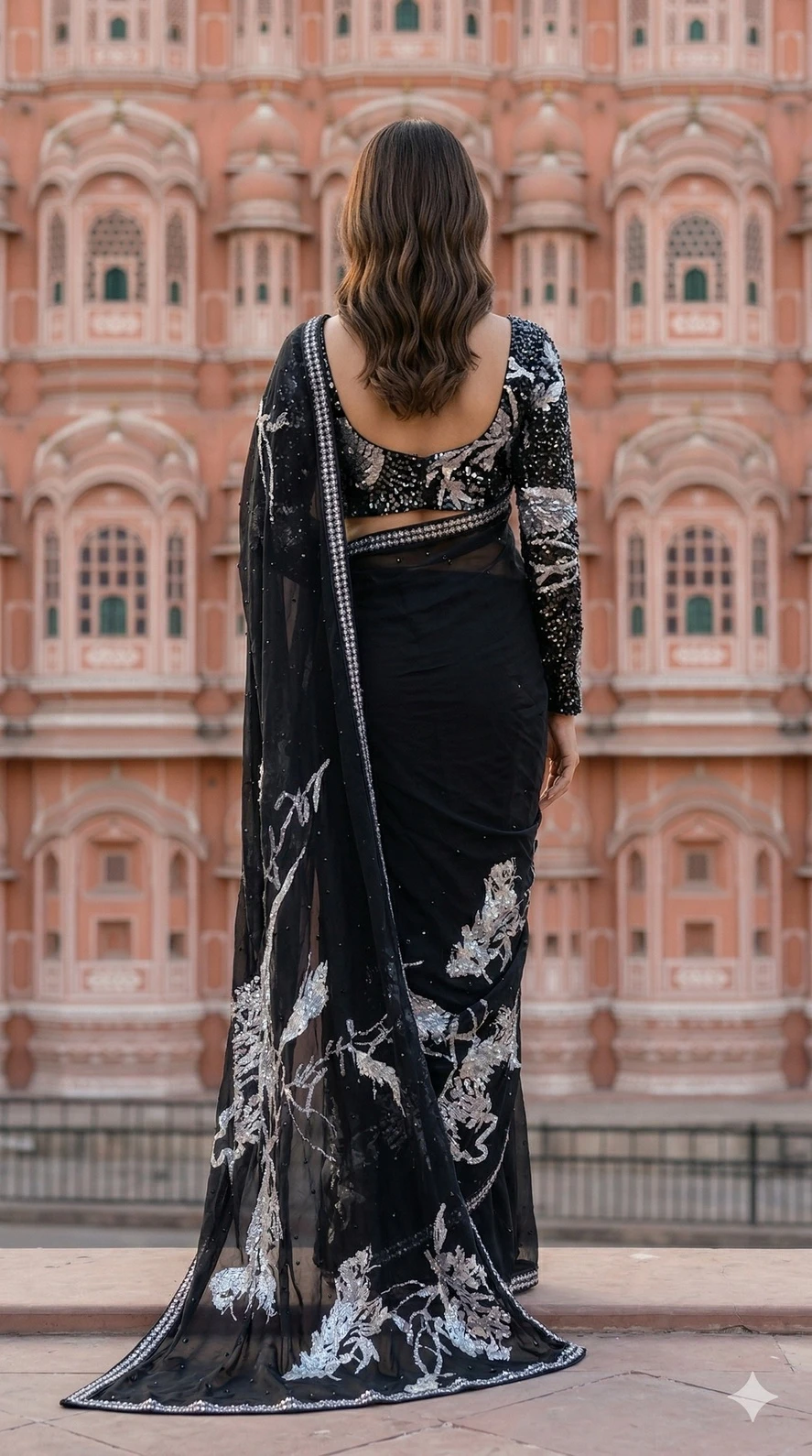 Style this Black Chiffon Saree with diamond or silver jewellery, a sleek ponytail or soft curls, and bold smokey eye makeup for a glamorous evening look. Pair it with metallic heels and a clutch to complete the elegant party ensemble.