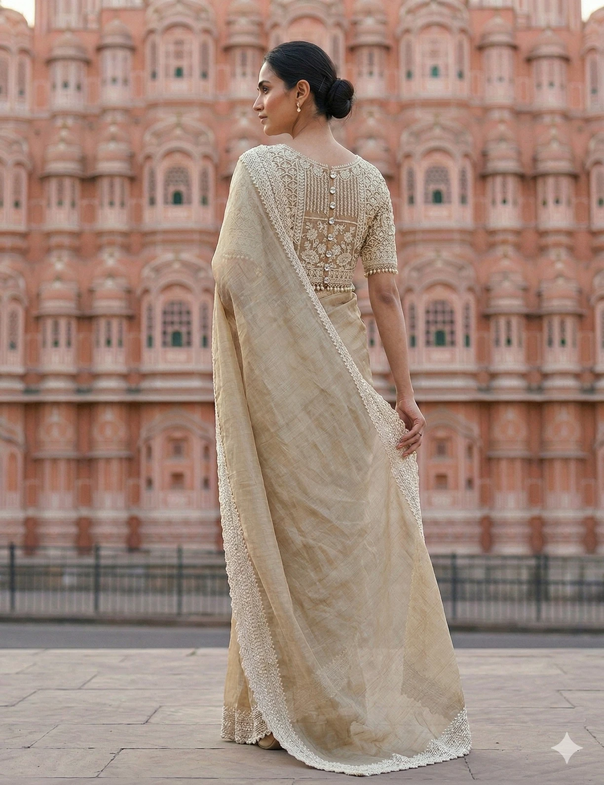Style this Champagne Tissue Silk Saree with pearl or diamond jewellery, soft glowing makeup, and a sleek bun or soft waves for an effortlessly graceful look. Pair it with nude or metallic heels and a minimal clutch to complete the sophisticated ensemble.