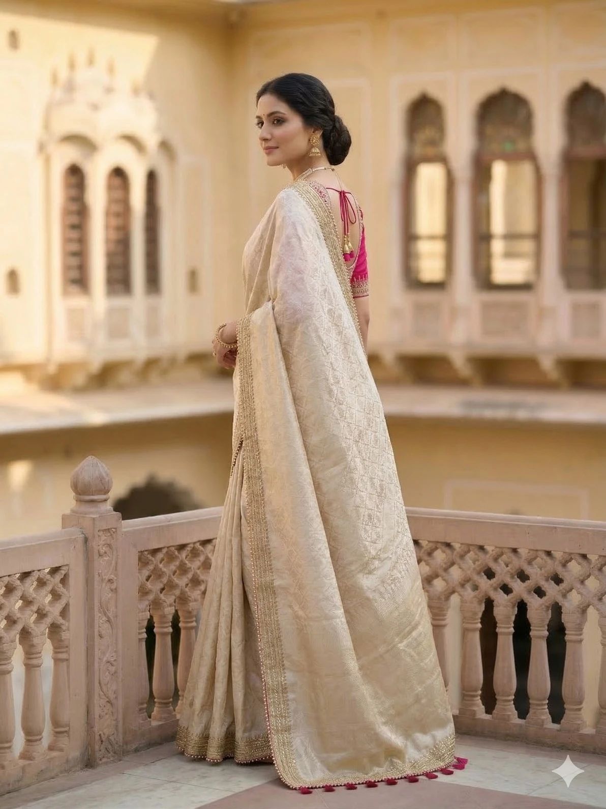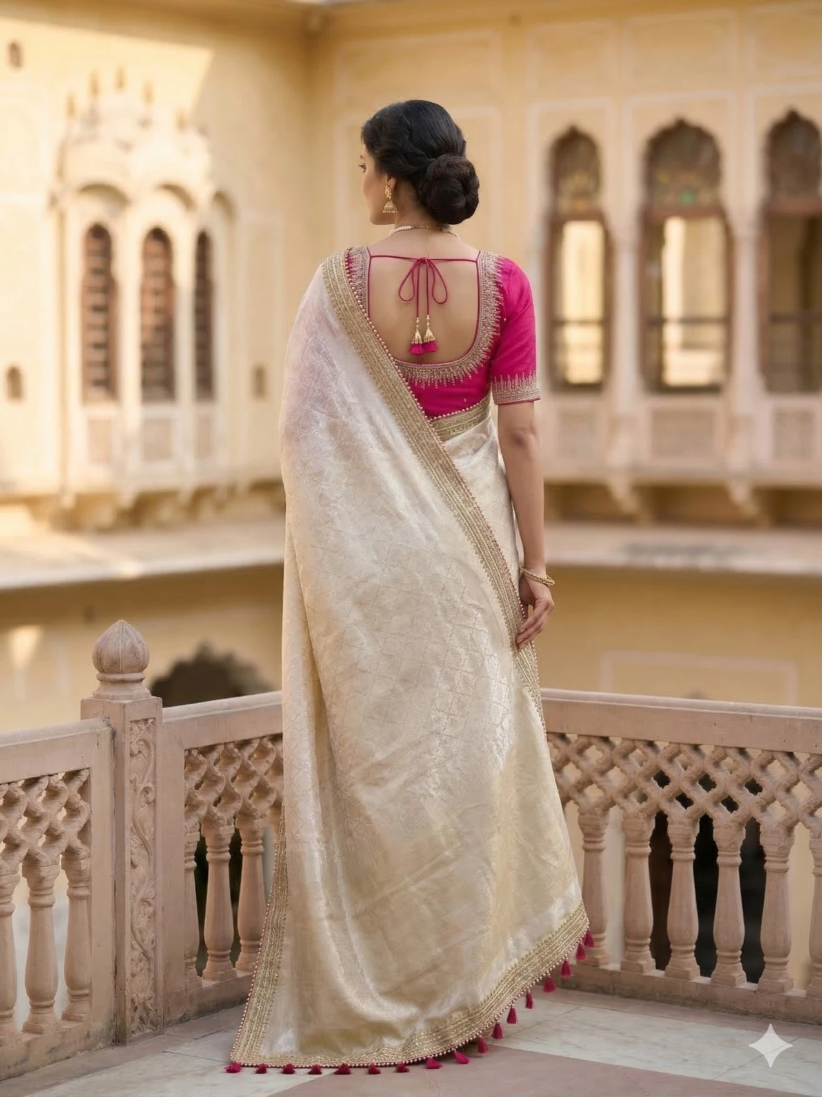 Style this Tissue Weaving Saree with gold, pearl, or kundan jewellery. Use the contrast blouse for festive occasions and the matching blouse for formal events. Complete the look with a sleek bun, soft glowing makeup, and metallic heels for a graceful and sophisticated ensemble.