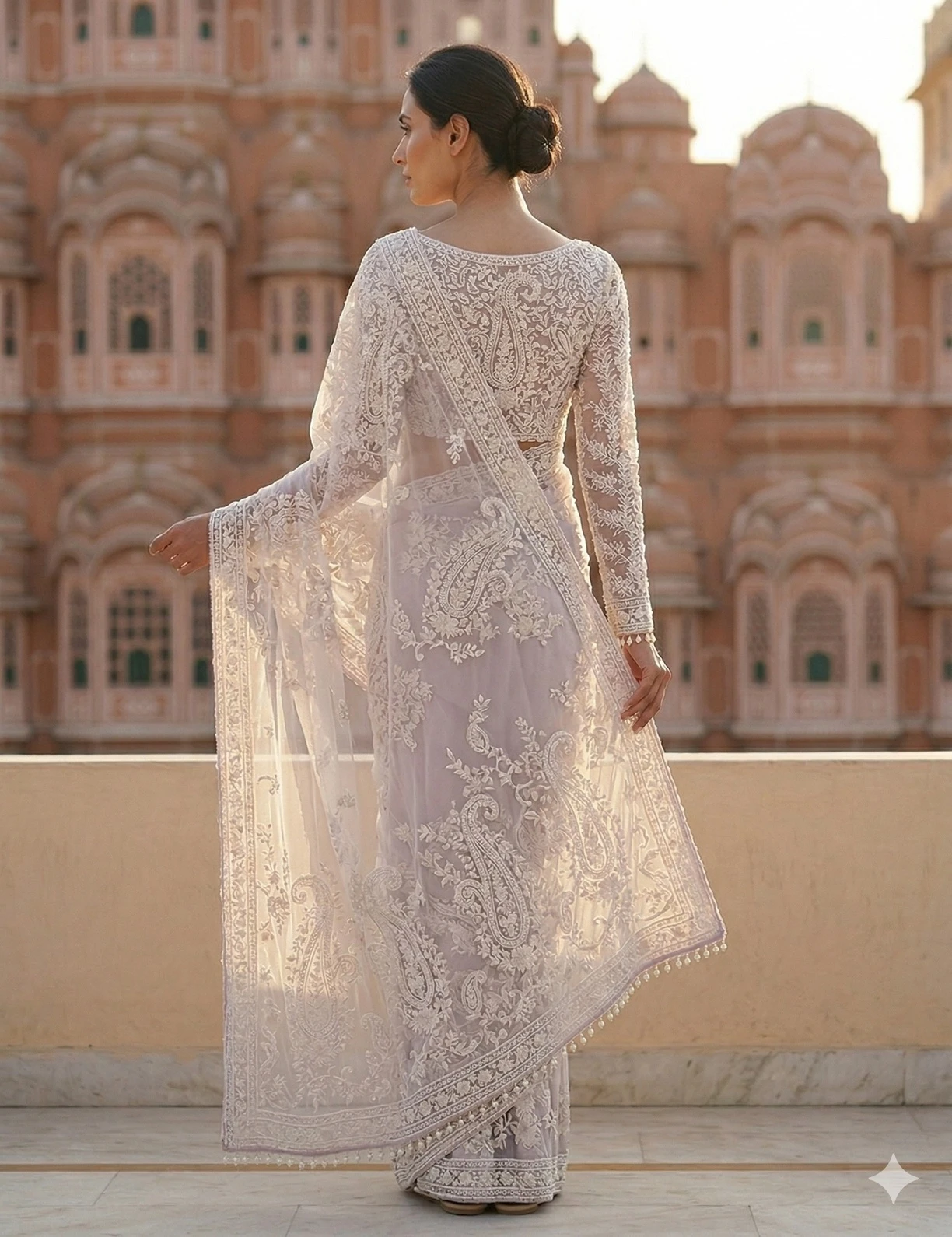 Style this Pearl White Net Saree with diamond or pearl jewellery, soft glowing makeup, and a sleek low bun or soft curls for an elegant and sophisticated look. Pair it with metallic heels and a delicate clutch to complete the glamorous festive outfit.