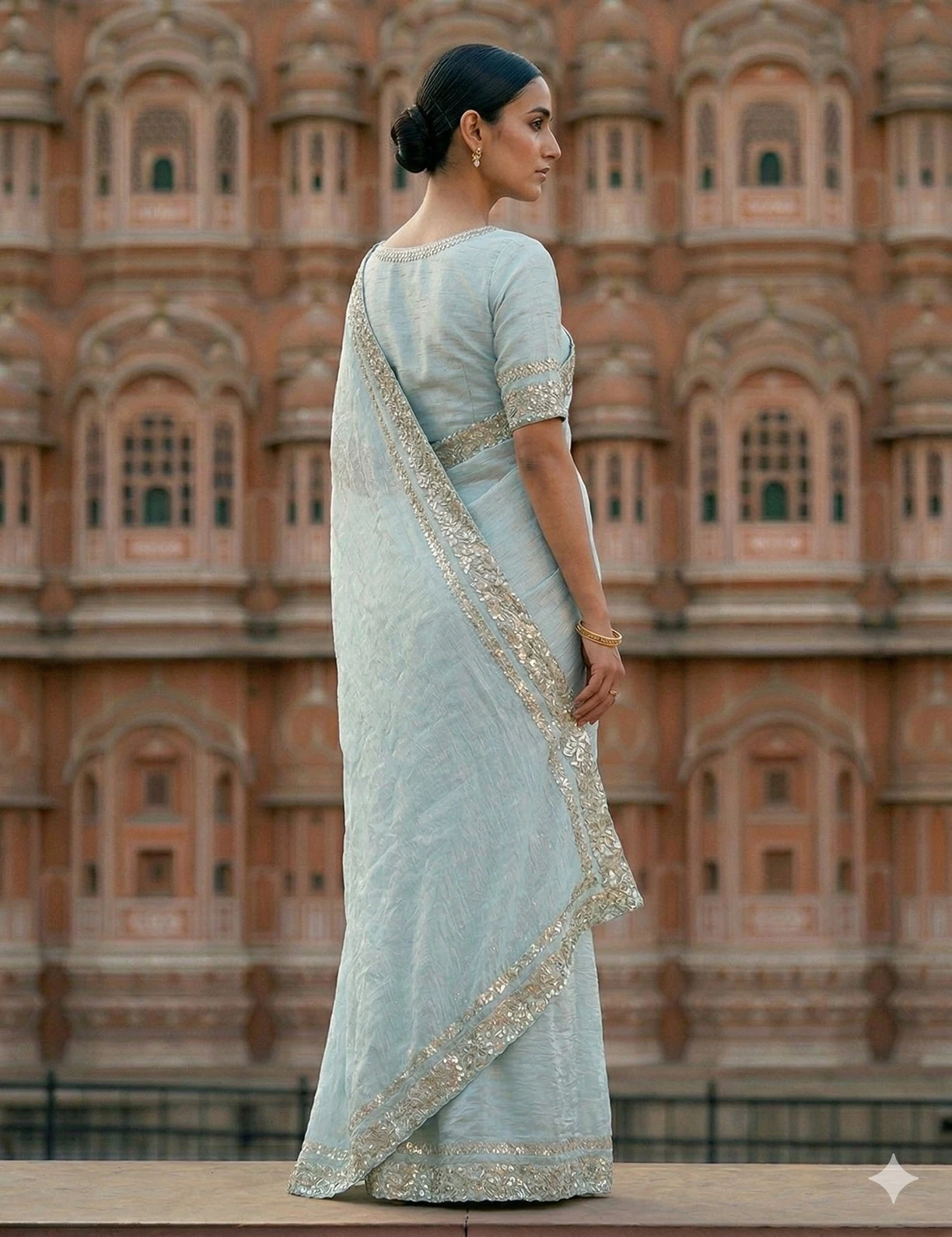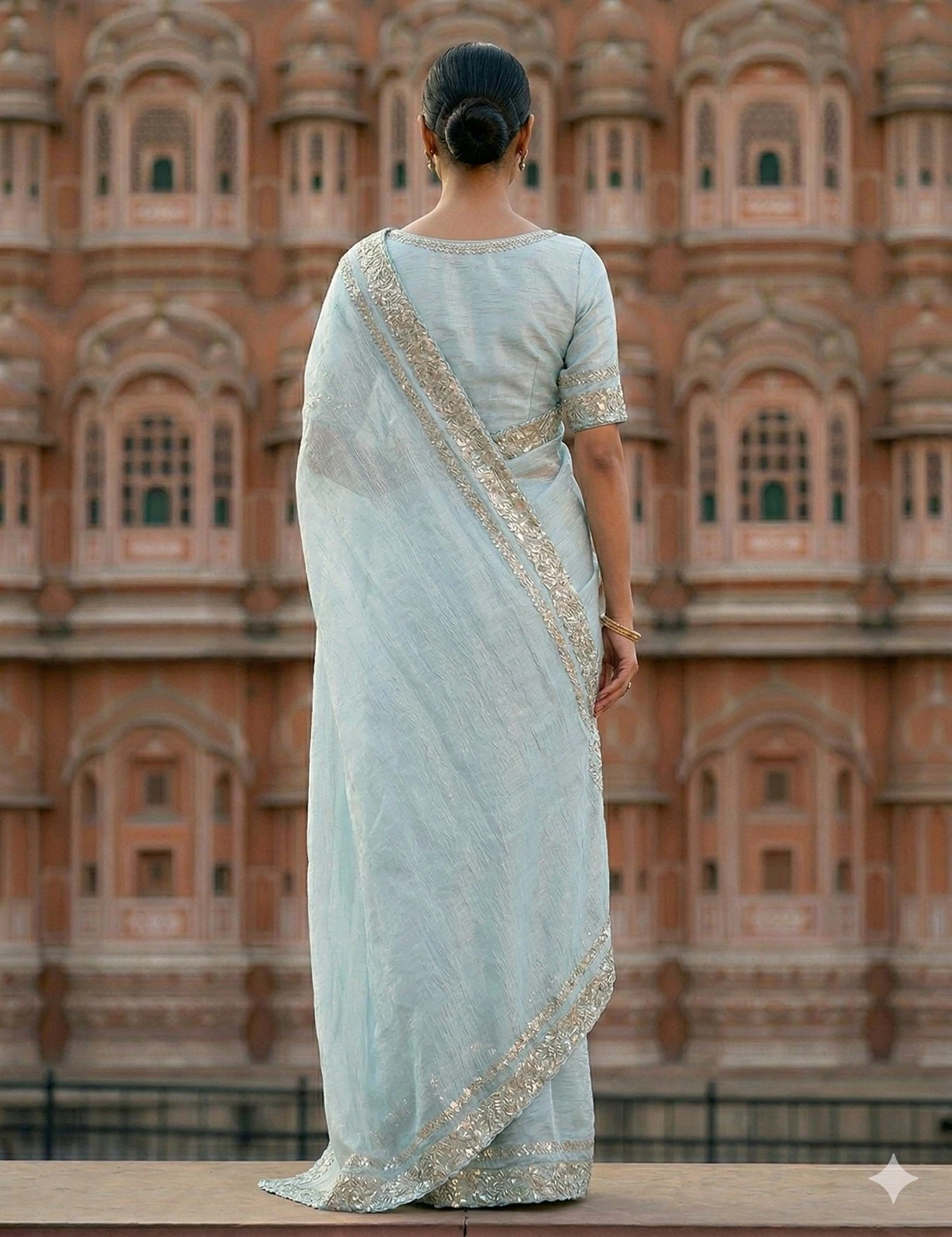 Style this Powder Blue Tissue Saree with diamond or silver jewellery, soft dewy makeup, and a sleek bun or loose curls for a graceful look. Pair it with silver heels and a metallic clutch to highlight the sparkle of the sequins border.