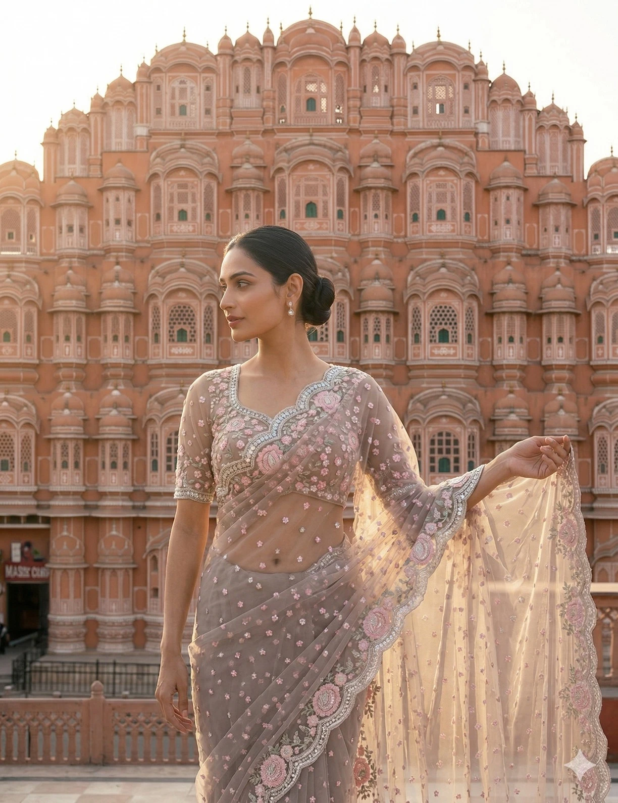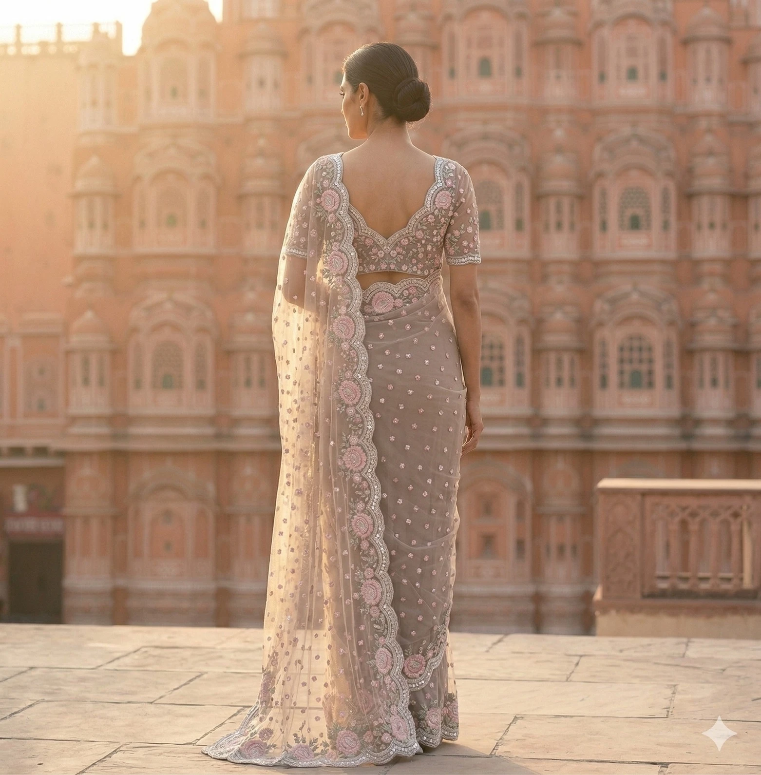 The highlight of this saree is its beautifully detailed scalloped embroidered border, adorned with intricate floral motifs that enhance the overall elegance of the drape. The soft taupe grey shade paired with delicate pink embroidery gives the saree a timeless and luxurious appeal. Perfect for weddings, receptions, cocktail events, festive celebrations, and evening parties, this saree is designed for women who love understated glamour.