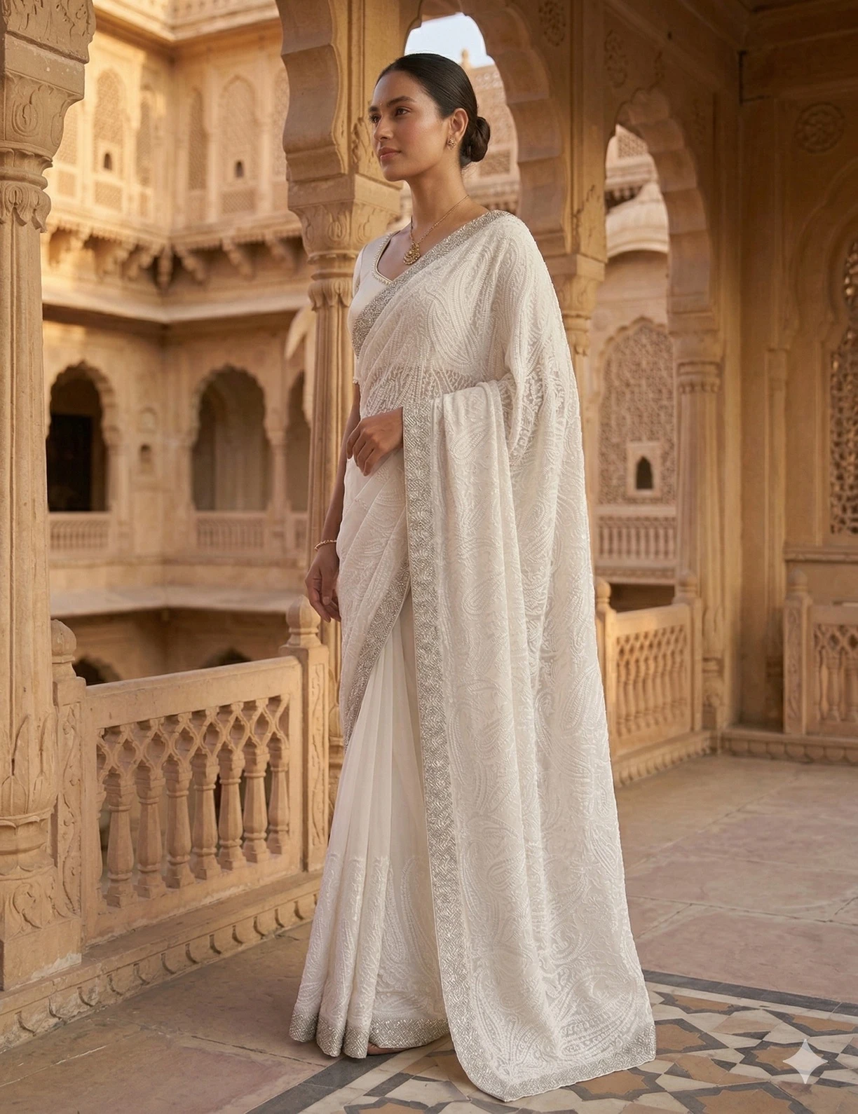Exude timeless grace with this elegant white georgette Chikankari saree, a perfect blend of heritage craftsmanship and modern sophistication. Crafted from lightweight georgette fabric, this saree offers a soft, flowy drape that enhances your silhouette while ensuring all-day comfort.