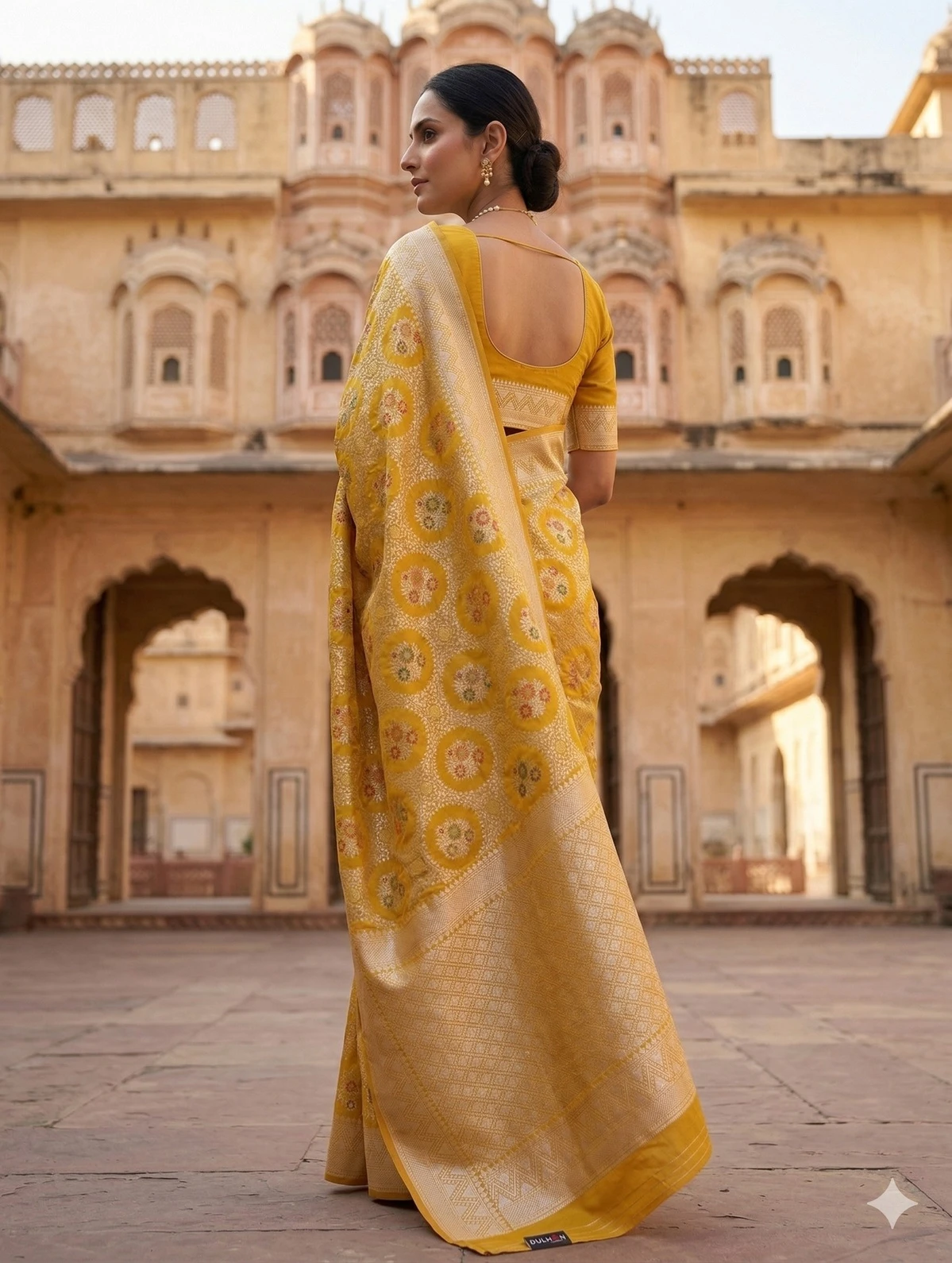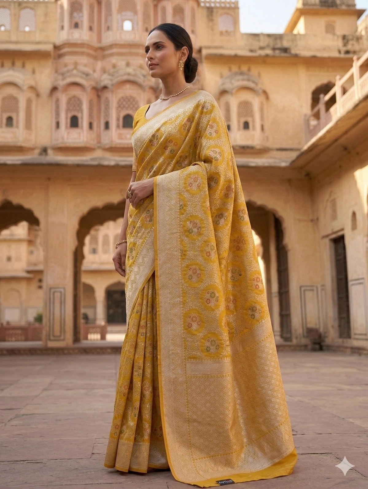 Celebrate timeless tradition with this exquisite mustard yellow Banarasi silk saree, crafted to reflect the richness of Indian heritage. Made from premium Banarasi silk, this saree features intricate zari weaving with classic circular and floral motifs that add depth and elegance to its design.