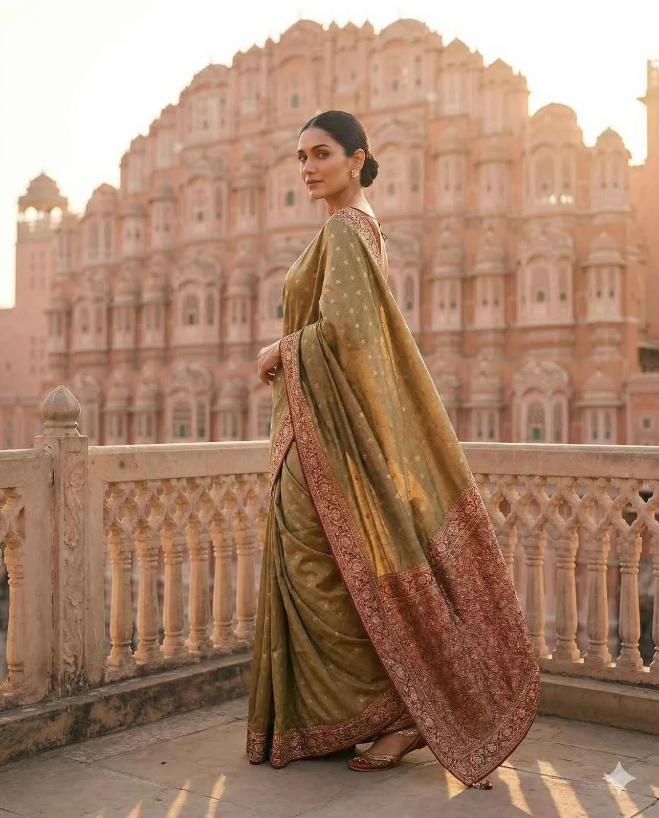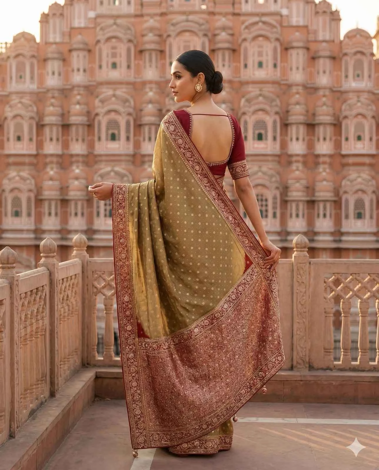 Exude timeless elegance with this sophisticated olive green Gajji silk saree, crafted for those who appreciate understated luxury. Made from premium Gajji silk, this saree offers a smooth texture and graceful drape. The body is adorned with delicate antique zari butti work, while the rich maroon woven border and intricately detailed pallu add depth and regal charm. Perfect for weddings, festive occasions, and cultural celebrations, this saree pairs beautifully with traditional gold jewelry for a classic, refined look.