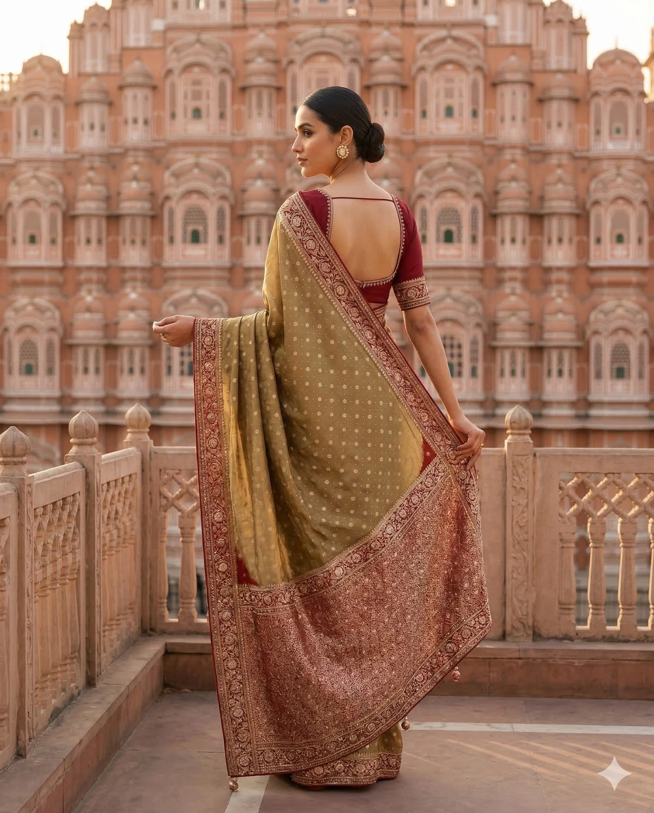 Pair this Olive Green Gajji Silk Saree with antique gold or kundan jewellery, a sleek low bun, and warm-toned makeup. Complete the look with embroidered heels or traditional juttis and a statement clutch for a regal festive appearance.