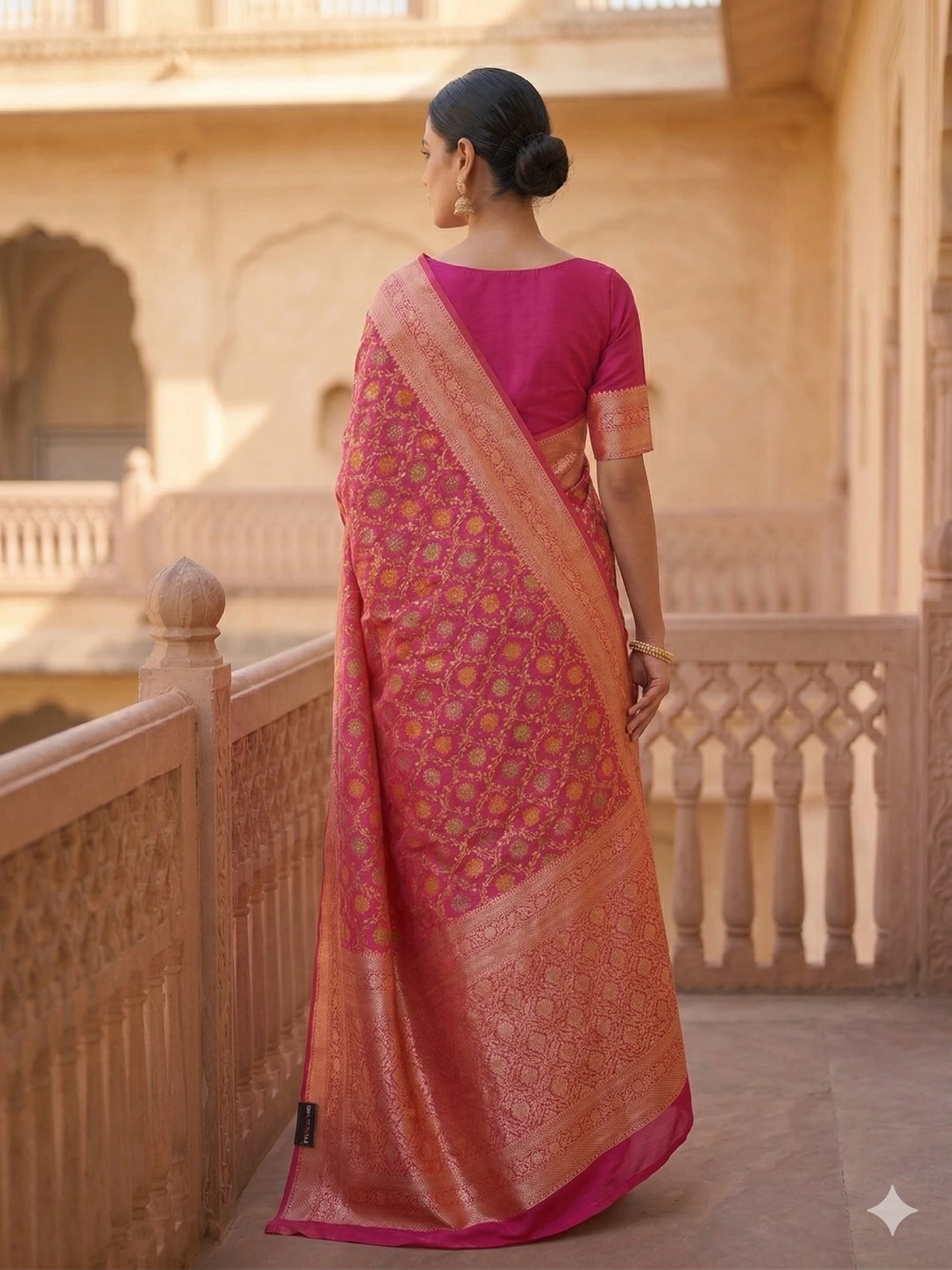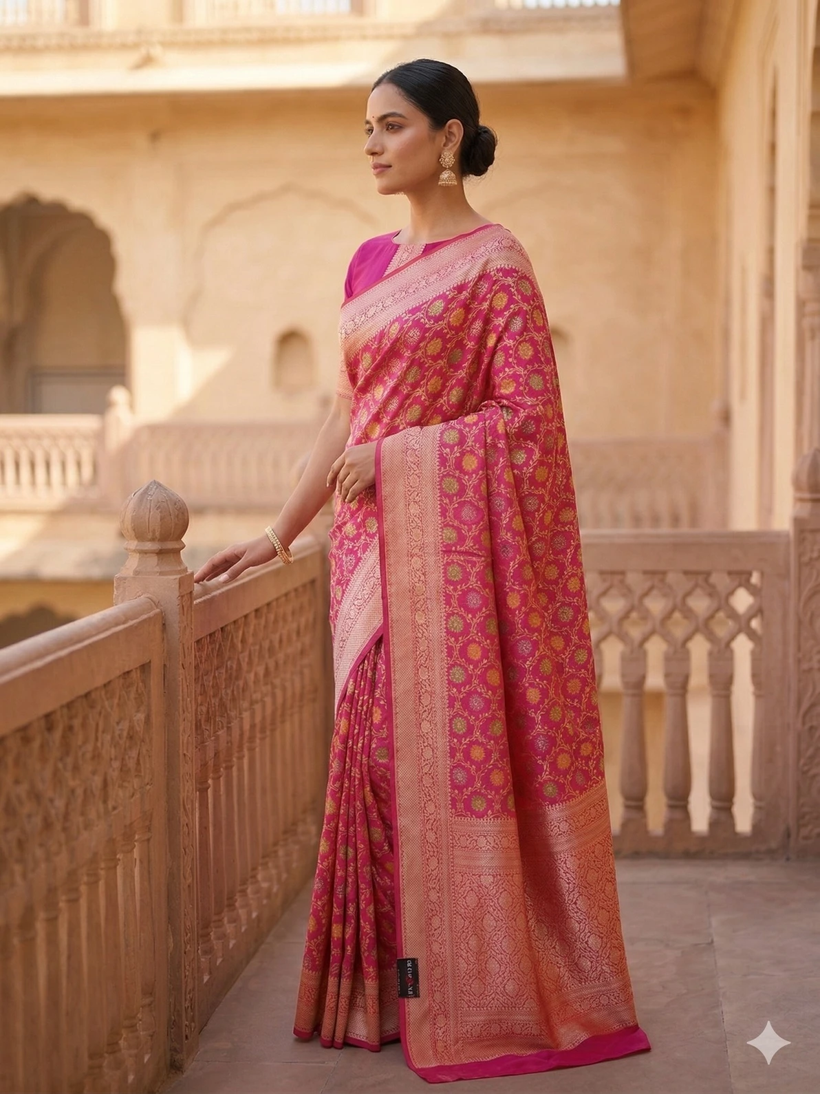 Pair this Rani Pink Banarasi Saree with traditional gold jewellery or temple jewellery, a sleek bun adorned with gajra, and soft glam makeup with a bold lip for a royal wedding-ready look. For a modern twist, style it with statement earrings and a contemporary blouse design.