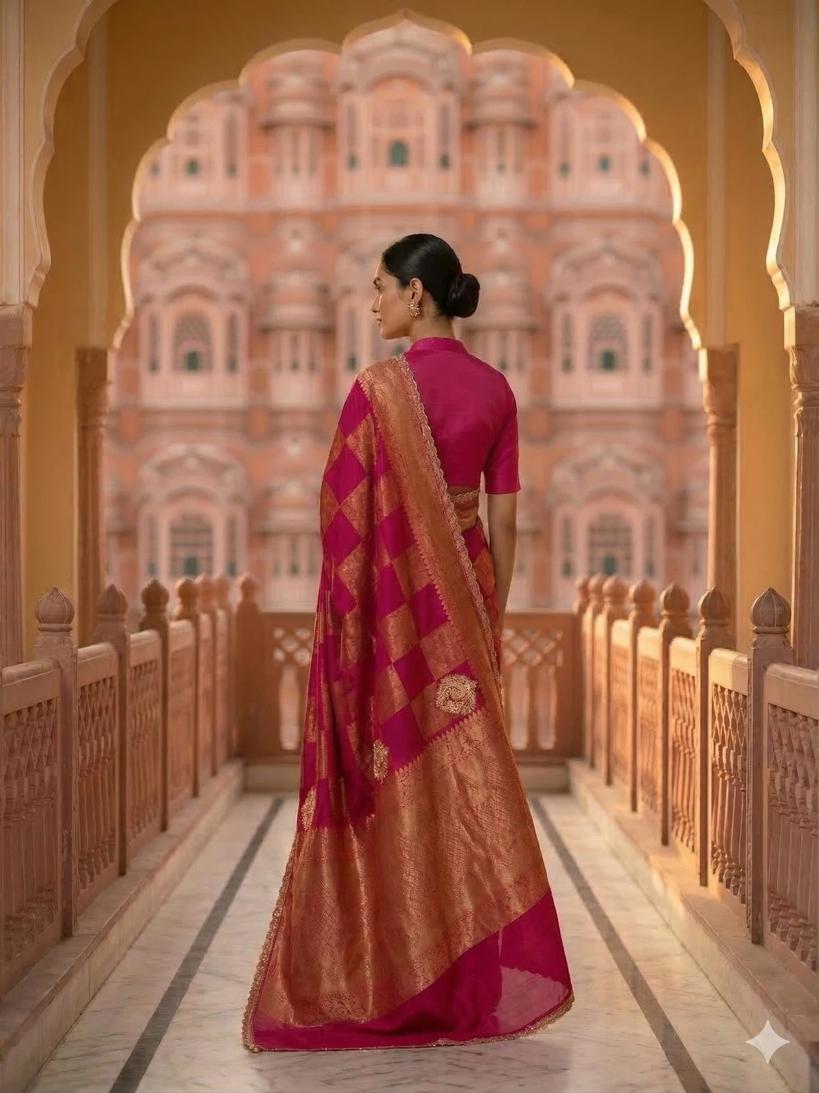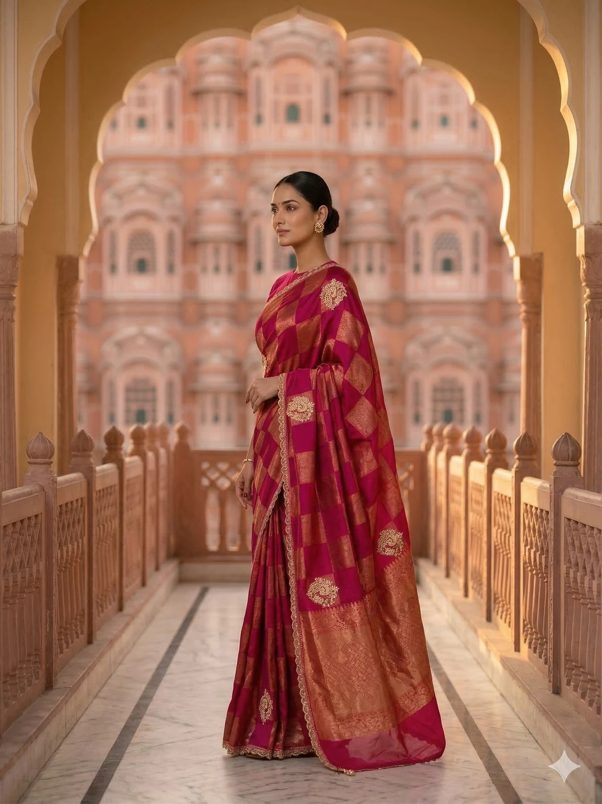 Make a regal statement with this Royal Rani Pink Gajji Silk Saree, crafted from luxurious gajji silk known for its smooth texture, rich feel, and elegant sheen. The vibrant rani pink hue beautifully highlights the intricate gold zari check pattern woven across the saree, creating a timeless blend of tradition and sophistication.