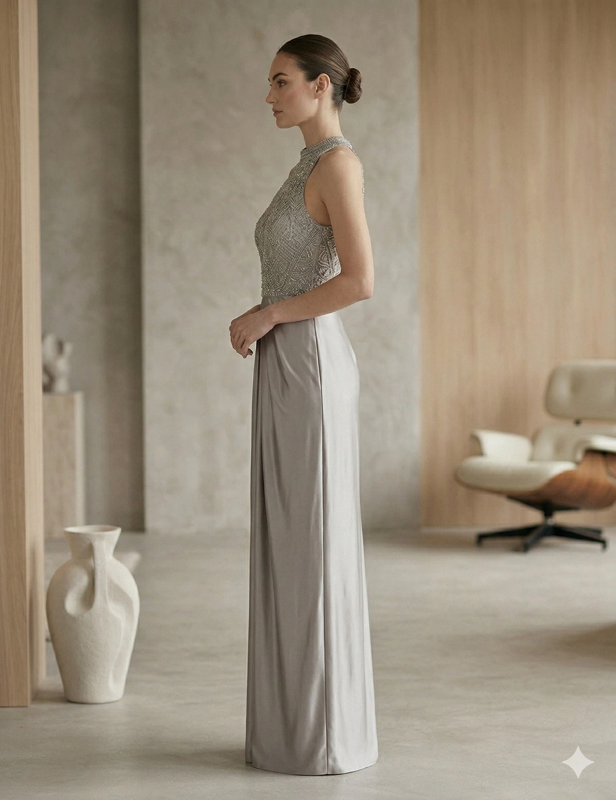 The gown flows into a graceful draped satin skirt, creating a flattering silhouette that enhances movement and elegance. The soft silver-grey tone adds understated glamour, making it an ideal choice for cocktail parties, evening receptions, formal events, and wedding celebrations.
