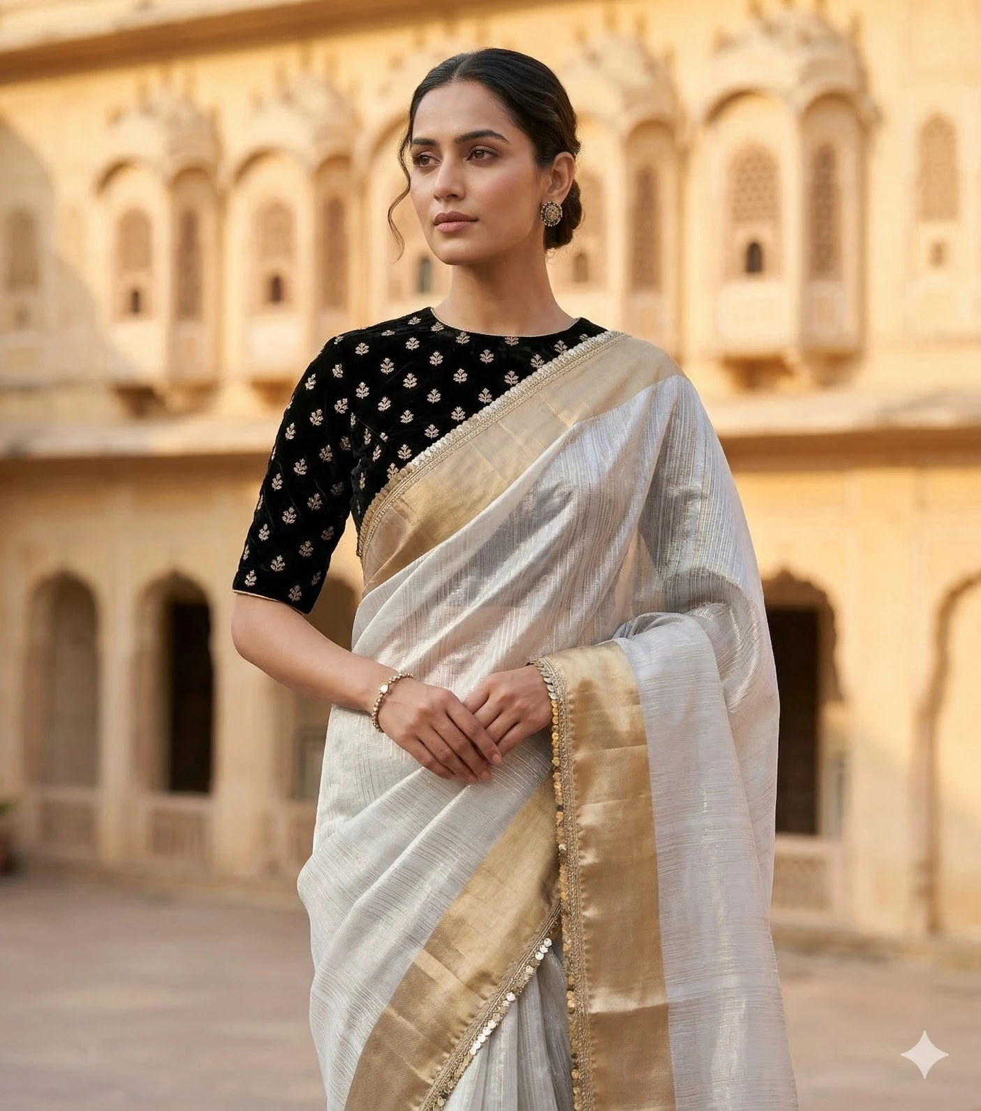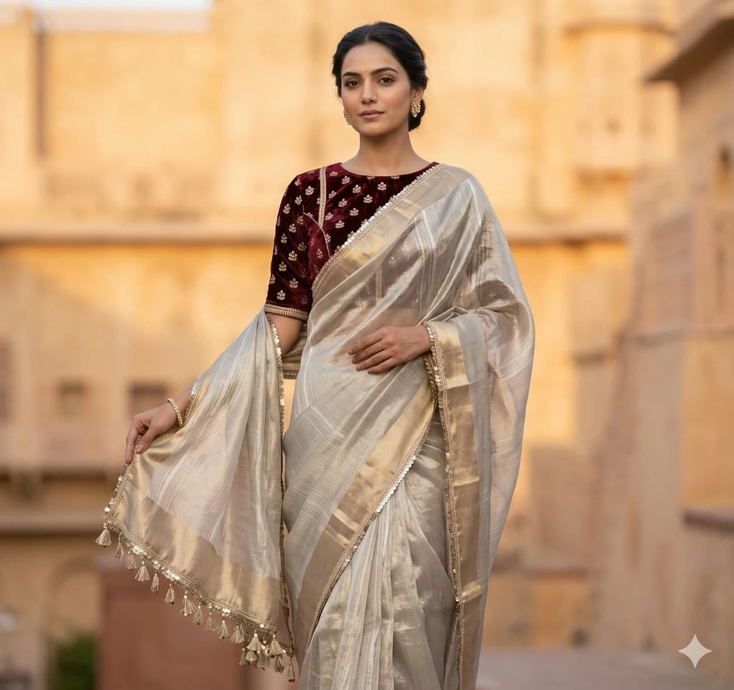Embrace timeless sophistication with this elegant silver tissue plain saree, designed for those who love minimal yet luxurious style. Crafted from premium tissue fabric, the saree features a subtle sheen that exudes grace and refinement.