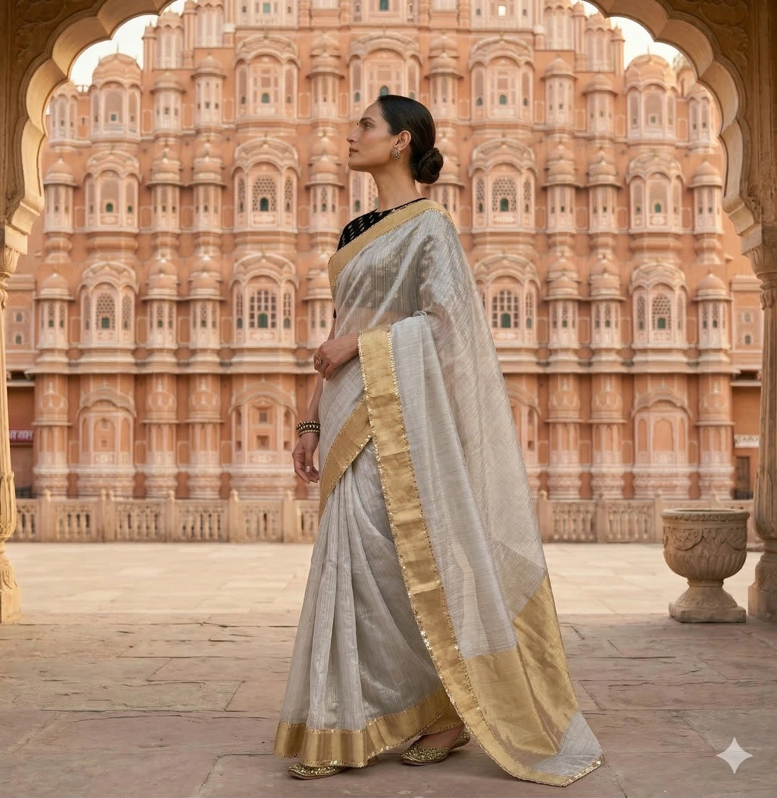 The highlight of this piece is its rich gold zari border, adding a regal contrast to the soft silver base. Its plain body enhances versatility, making it perfect for styling with statement blouses—from classic black to vibrant festive hues. Lightweight and effortlessly drapable, this saree is ideal for weddings, festive celebrations, and formal occasions.